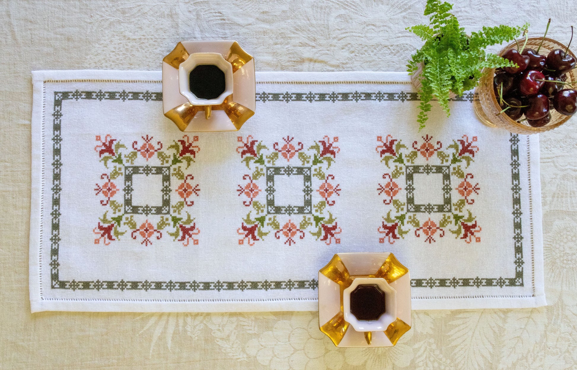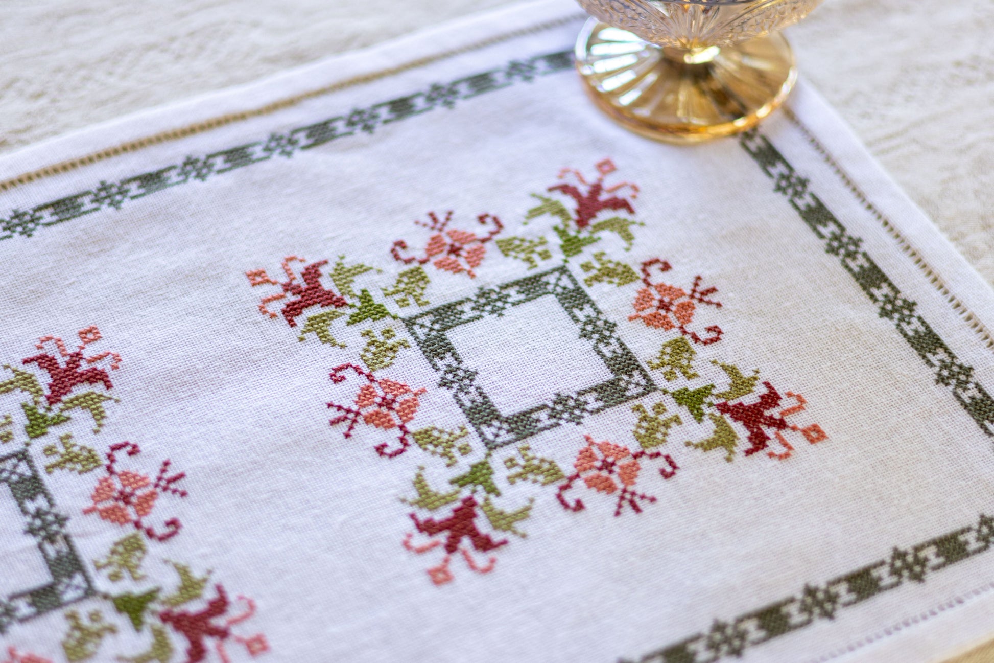 The Anthea table runner folk embroidery kit showcases the beauty of repetition that is frequently found in folk embroidery. Delicate floral squares are repeated across and then finished with a geometric border to create a charming table runner that coordinates with many décor styles. Kit includes: 26ct 100% cotton Traditional Groundcloth in white, DMC 100% cotton embroidery floss, John James size 24 needle, full color charts and instructions (a PDF copy of the pattern will also be sent to you)..