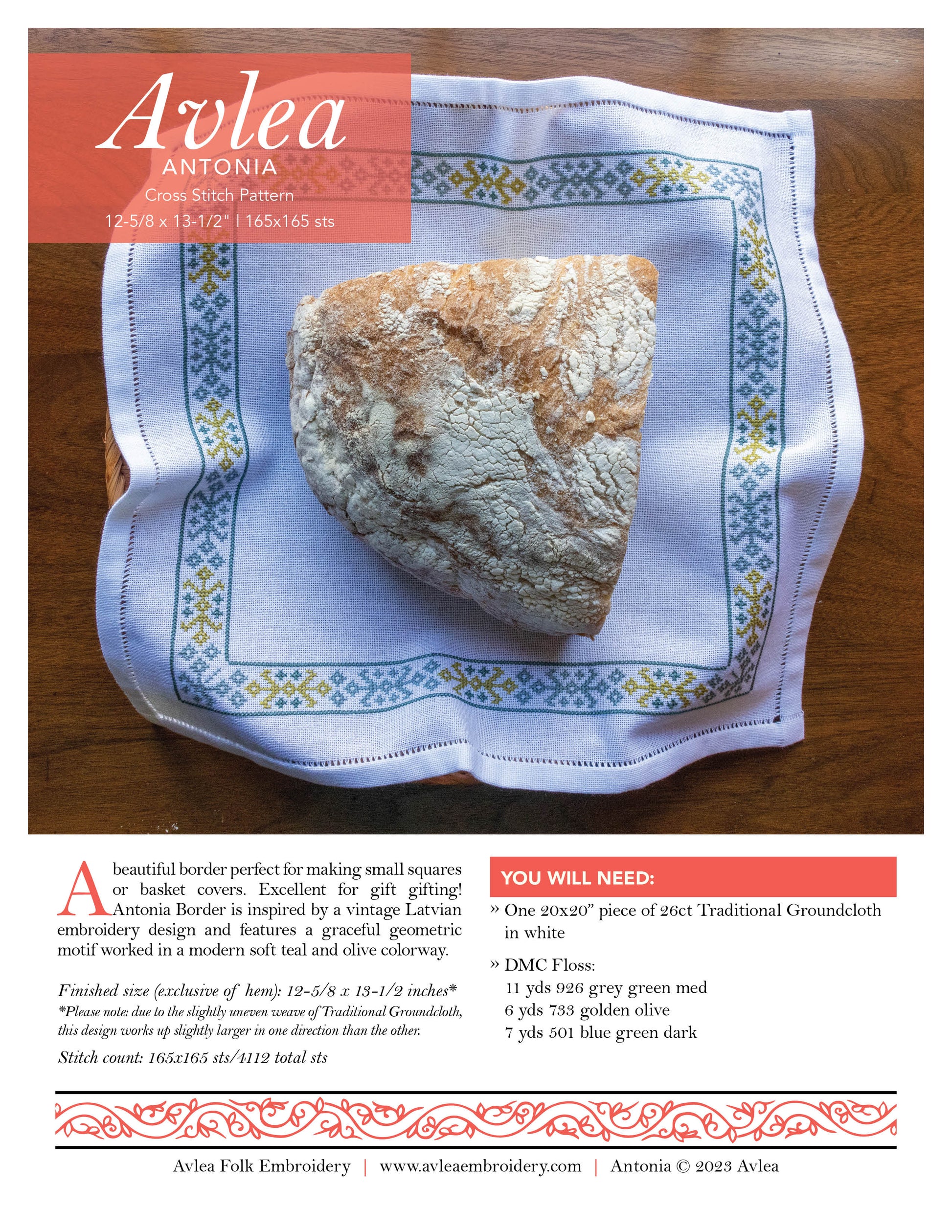 The Antonia folk embroidery kit features a beautiful border perfect for making small squares or basket covers. Excellent for gift gifting! Antonia Border is inspired by a vintage Latvian embroidery design and features a graceful geometric motif worked in a modern soft teal and olive colorway. Kit includes: 26ct 100% cotton Traditional Groundcloth in white, DMC 100% cotton embroidery floss, John James size 24 needle, full color charts and instructions (a PDF copy of the pattern will also be sent to you).