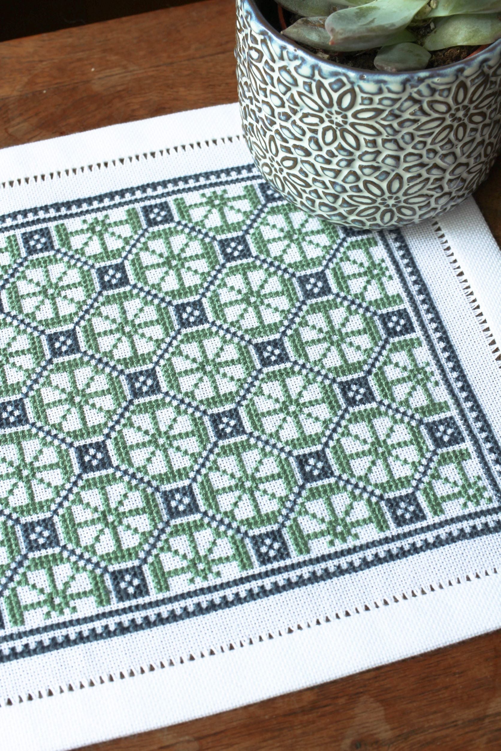 In ancient Greek, chloris meant “green buds” and the BitKit Chloris folk embroidery kit features a beautiful repeating design is make up of little flower buds outlined in green. Folk embroidery designs often utilize negative space and this design is a wonderful example with its little buds created out of the negative space set within a diamond lattice. True to its name, it is worked in a lovely shade of blue-green outlined in deep grey green. Kit includes: 30ct 100% cotton Mikini in white, DMC 100% cotton embroidery floss, John James size 24 needle, full color charts and instructions.