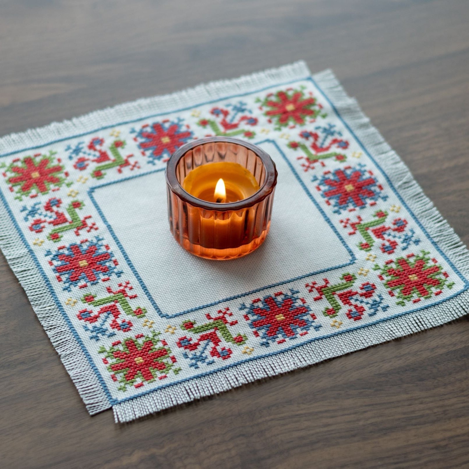 The BitKit Mykonos Meadow folk embroidery kit is inspired by stylized floral and leaf motifs from Greek island folk embroideries. Stitched in a cheerful palette of coral, leaf green, antique blue and soft yellow, it makes a delightful little table mat to brighten any room. Kit includes: 25ct 100% cotton Evenweave in Mediterranean Jasmine, DMC 100% cotton embroidery floss, John James size 24 needle, full color charts and instructions.