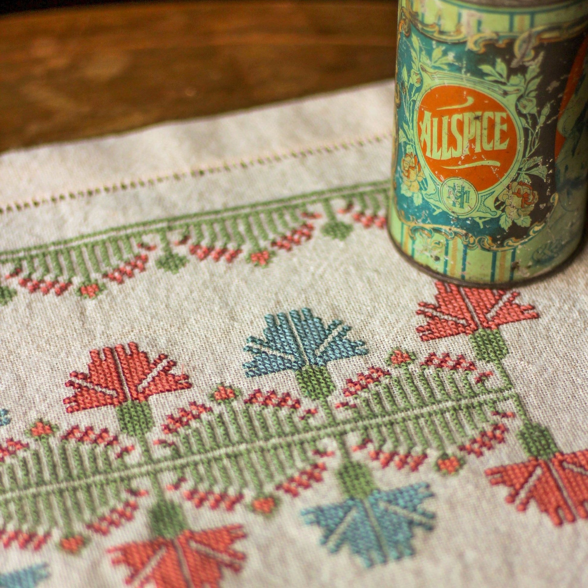 The Calliope's Meadow folk embroidery kit—inspired by a tiny border on a traditional bed curtain from the Greek islands—is made up of carnations alternating with flower bud sprays which create a beautiful chevron border effect. The fresh and delicate colors evoke a meadow presided over by Calliope, muse of poetry and eloquence. Shown worked as a table runner, it would be beautiful as a cushion cover or wall hanging. Kit includes: 26ct 100% cotton Traditional Groundcloth in natural, DMC 100% cotton embroidery floss, John James size 24 needle, full color charts and instructions (a PDF copy of the pattern will also be sent to you).