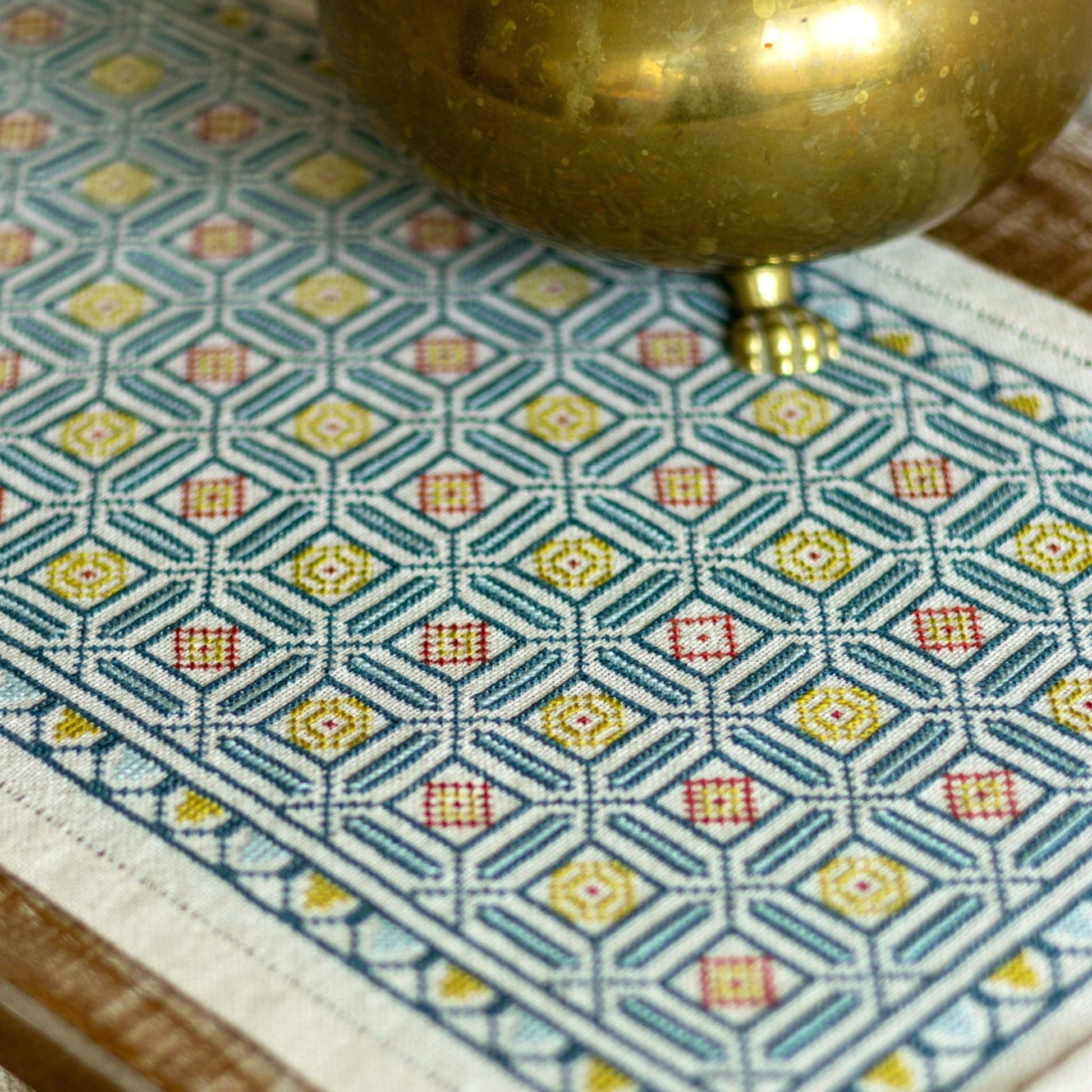 A striking allover design, the Efimia folk embroidery kit is inspired by a mosaic floor from the House of Stone Carpets adjacent to the church of St Efimia in Ravenna, Italy. Small star and octagon motifs are set within squares, which are then set within octagons resulting in a rhythmic yet energetic design. Shown worked in a historic color palette of warm blues, golden olive, and terra cotta and finished as a table runner, this design can also be finished as a bolster cushion cover. Kit includes: 26ct 100% cotton Traditional Groundcloth in natural, DMC 100% cotton embroidery floss, John James size 24 needle, full color charts and instructions (a PDF copy of the pattern will also be sent to you)..
