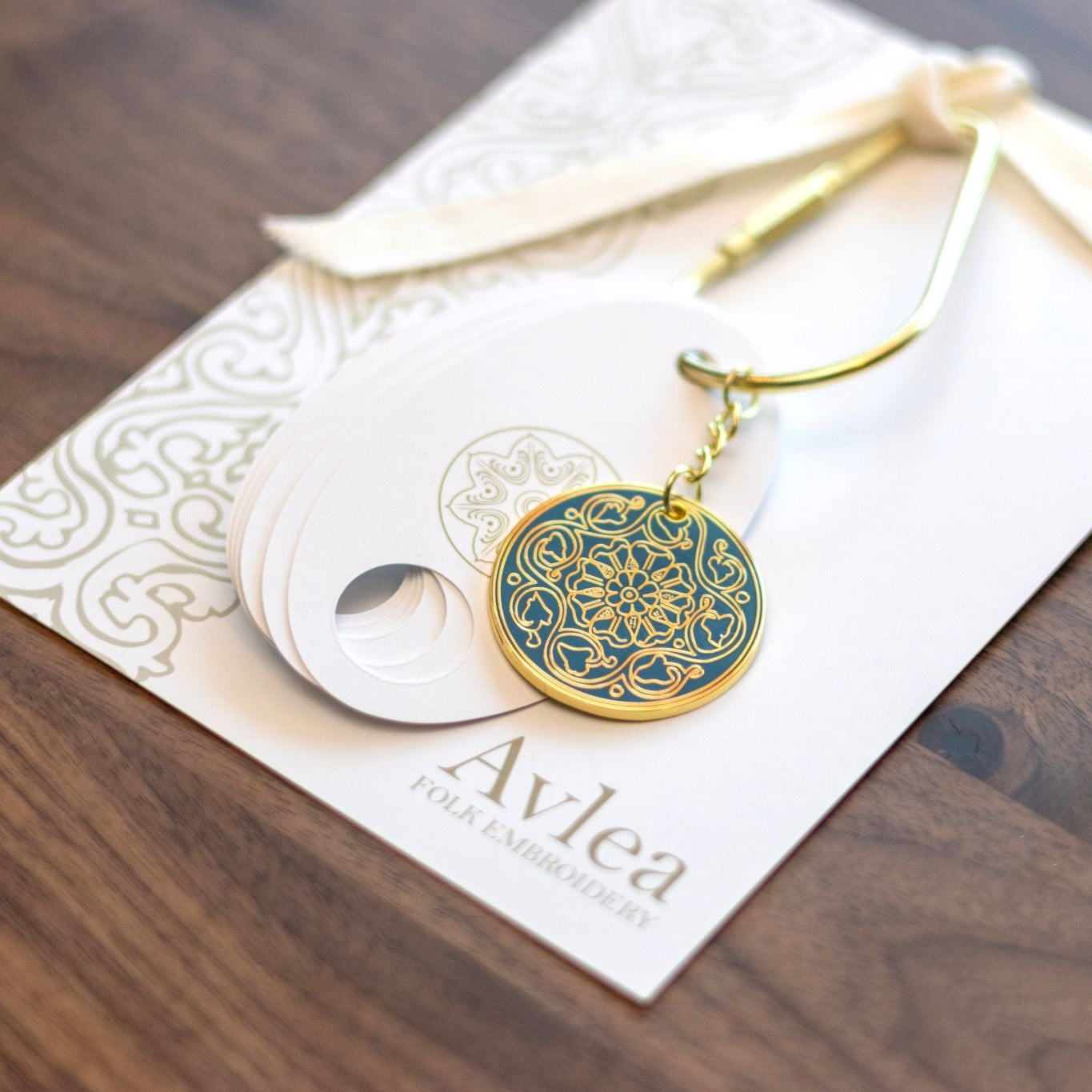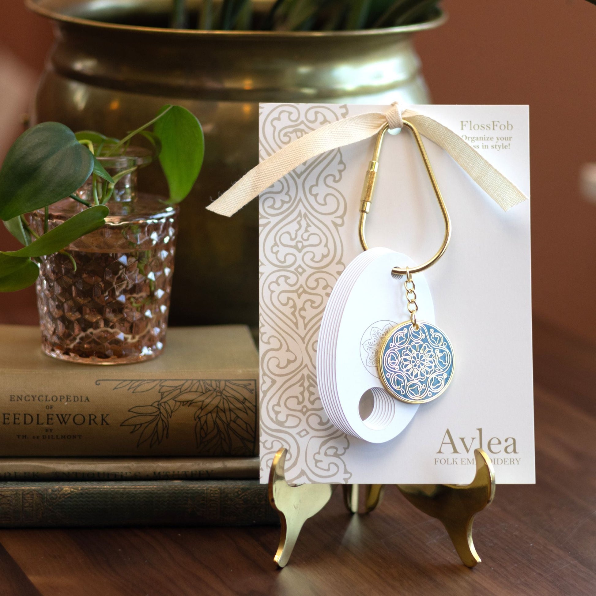 Looking for a beautiful way to organize your floss? The Avlea FlossFob features a large oval ring with a barrel clasp which allows you to add floss organizers for various stitching projects. Ornamented with the Arcadian Rose enamel medallion, the FlossFob comes with 8 floss organizers and is a lovely notion to add to your stitching tools or give as a gift.