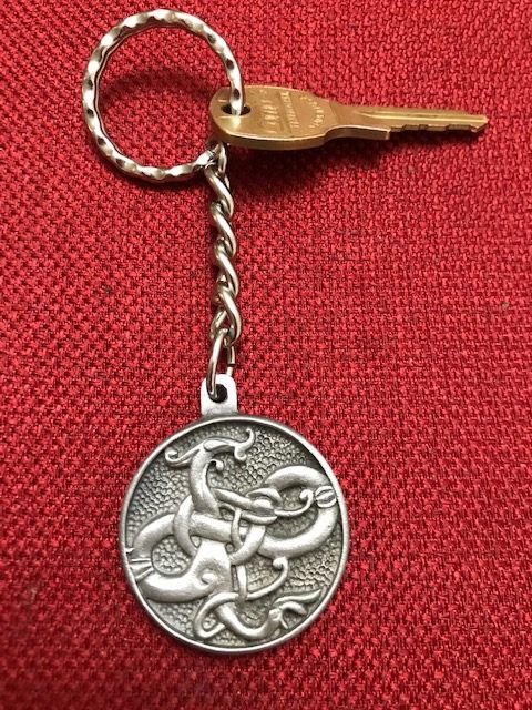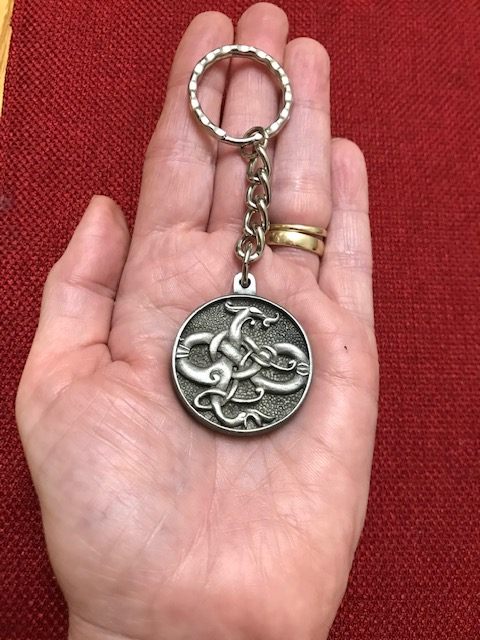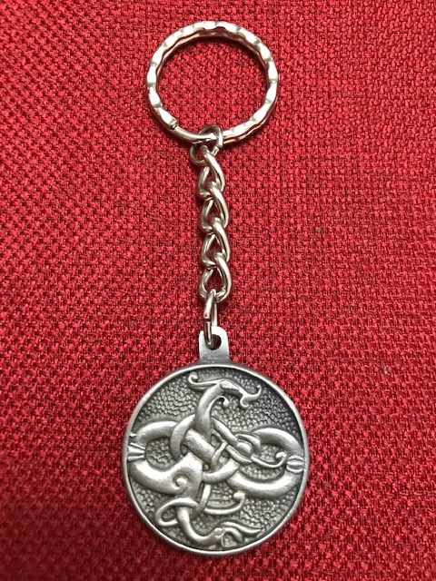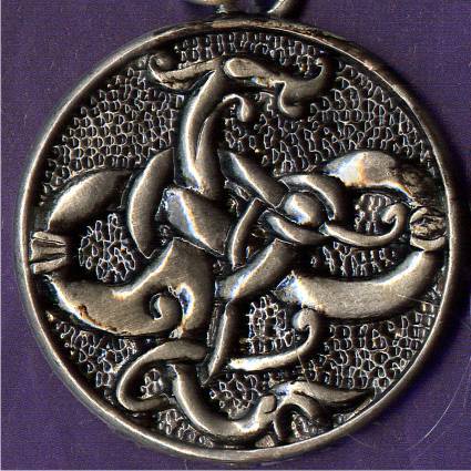 This roundel design was taken from an 11th-century design found on a silver bowl in Gotland, Sweden. It contains a Viking Urnes style intertwined serpent.