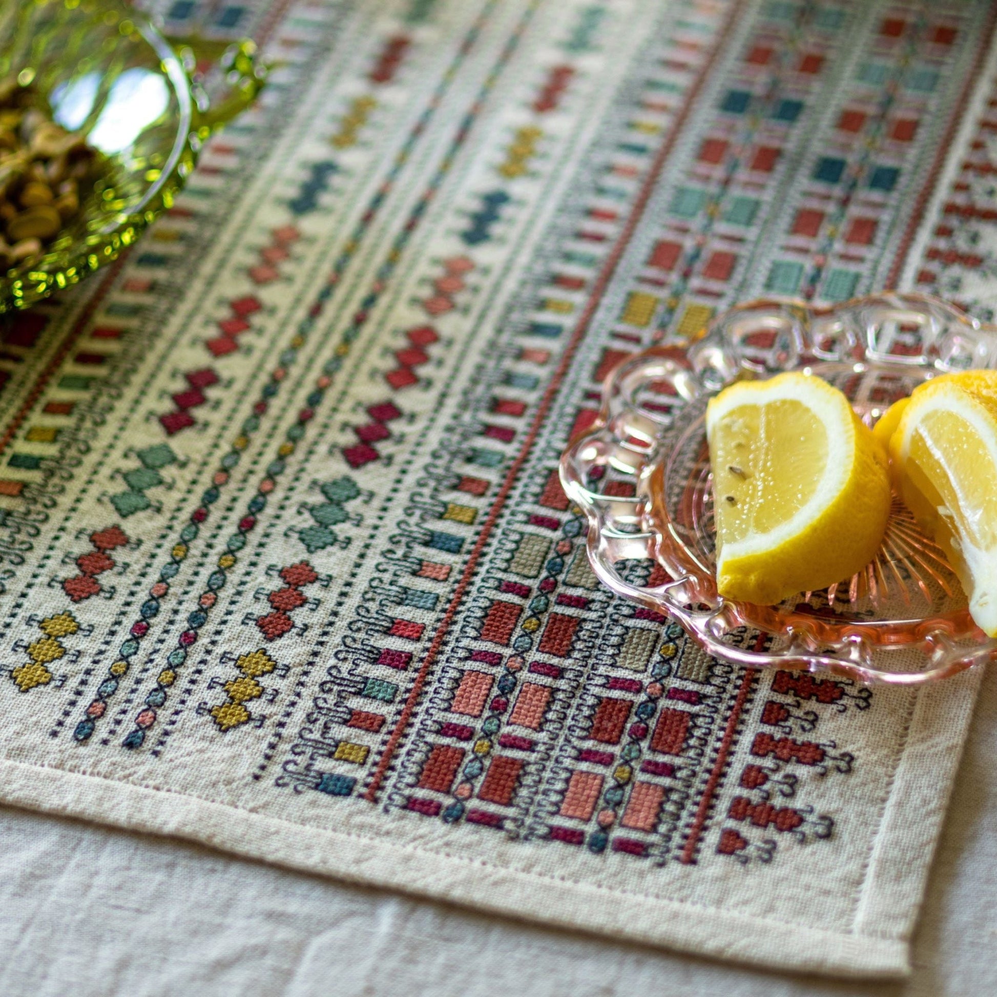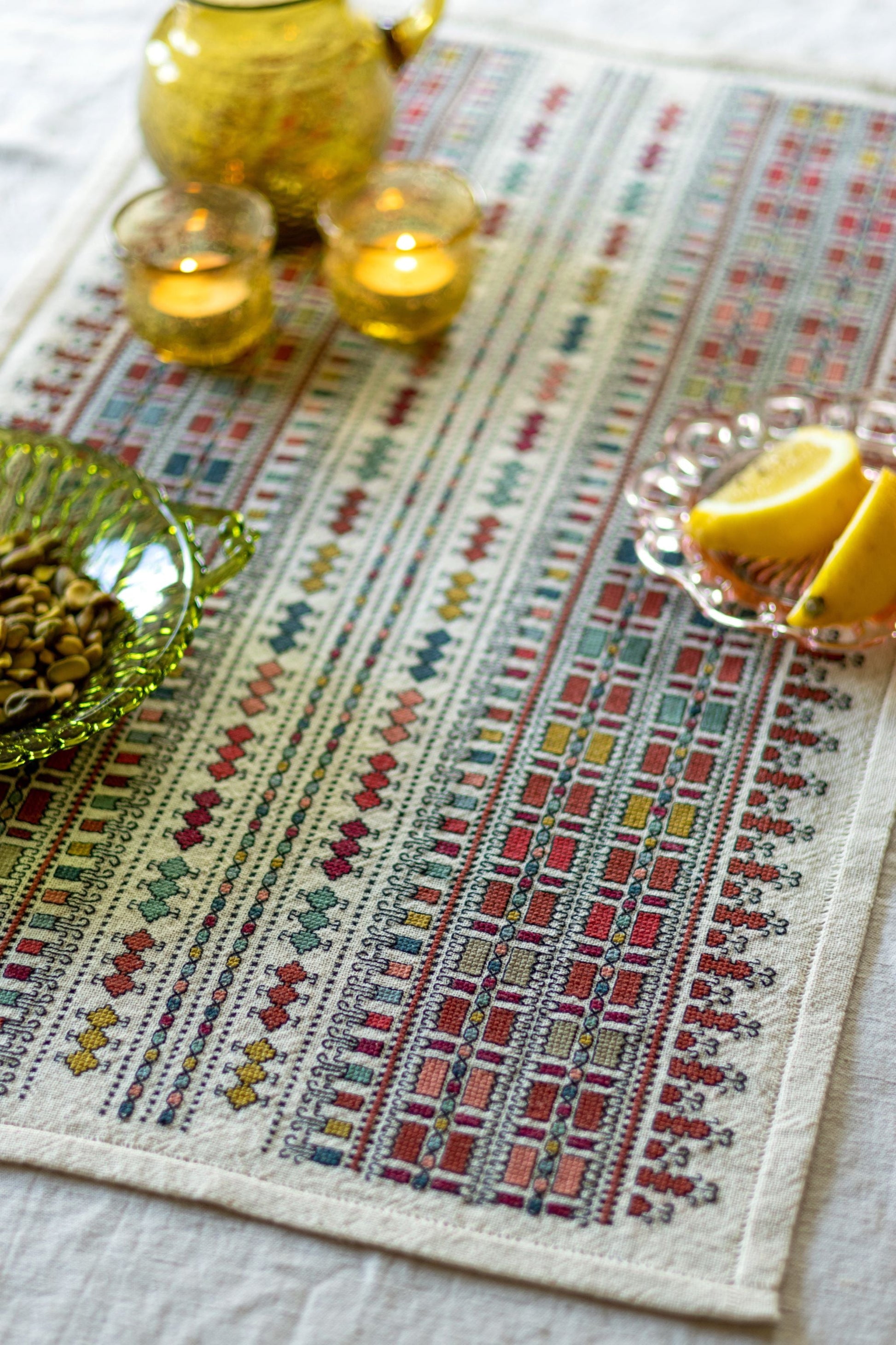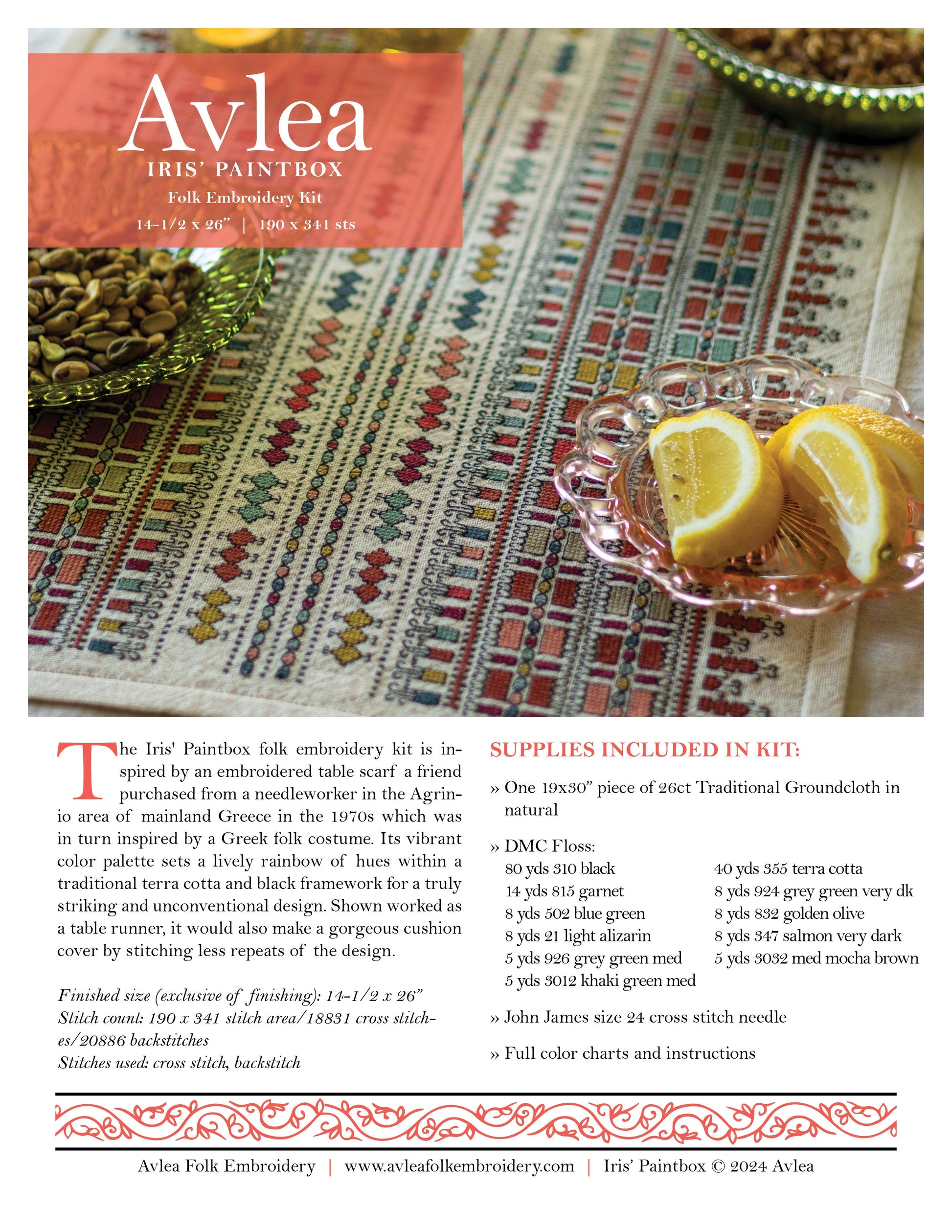 The Iris' Paintbox folk embroidery kit is inspired by an embroidered table scarf a friend purchased from a needleworker in the Agrinio area of mainland Greece in the 1970s which was in turn inspired by a Greek folk costume. Its vibrant color palette sets a lively rainbow of hues within a traditional terra cotta and black framework for a truly striking and unconventional design. Shown worked as a table runner, it would also make a gorgeous cushion cover by stitching less repeats of the design. Kit includes: 26ct 100% cotton Traditional Groundcloth in natural, DMC 100% cotton embroidery floss, John James size 24 needle, full color charts and instructions (a PDF copy of the pattern will also be sent to you).
