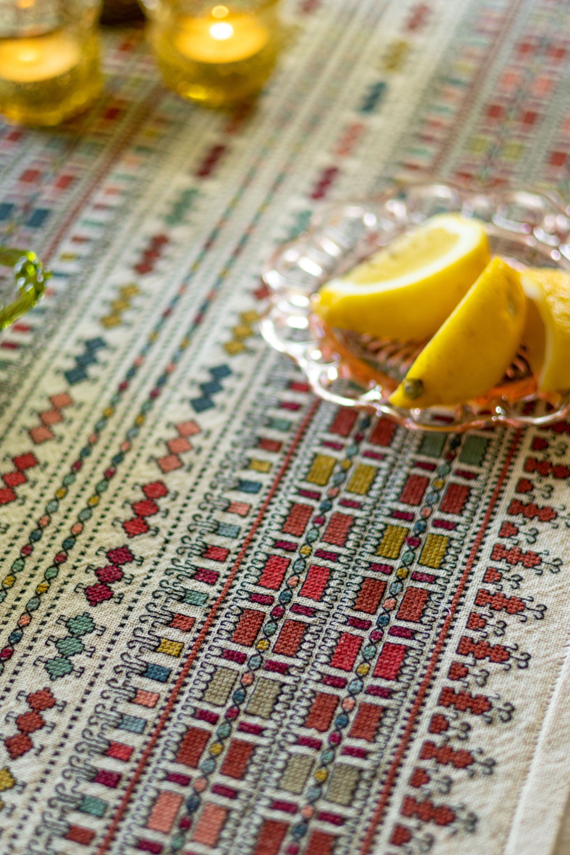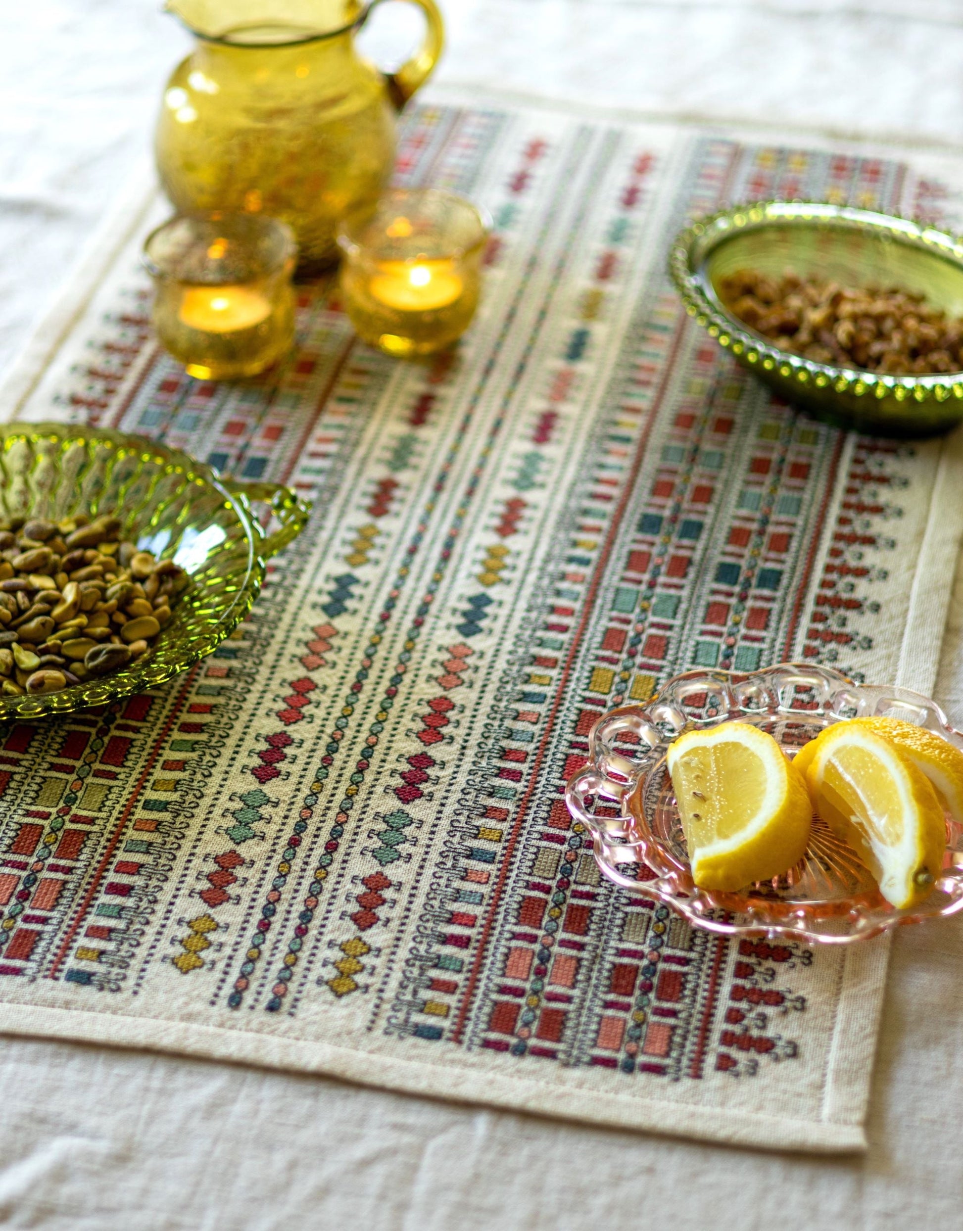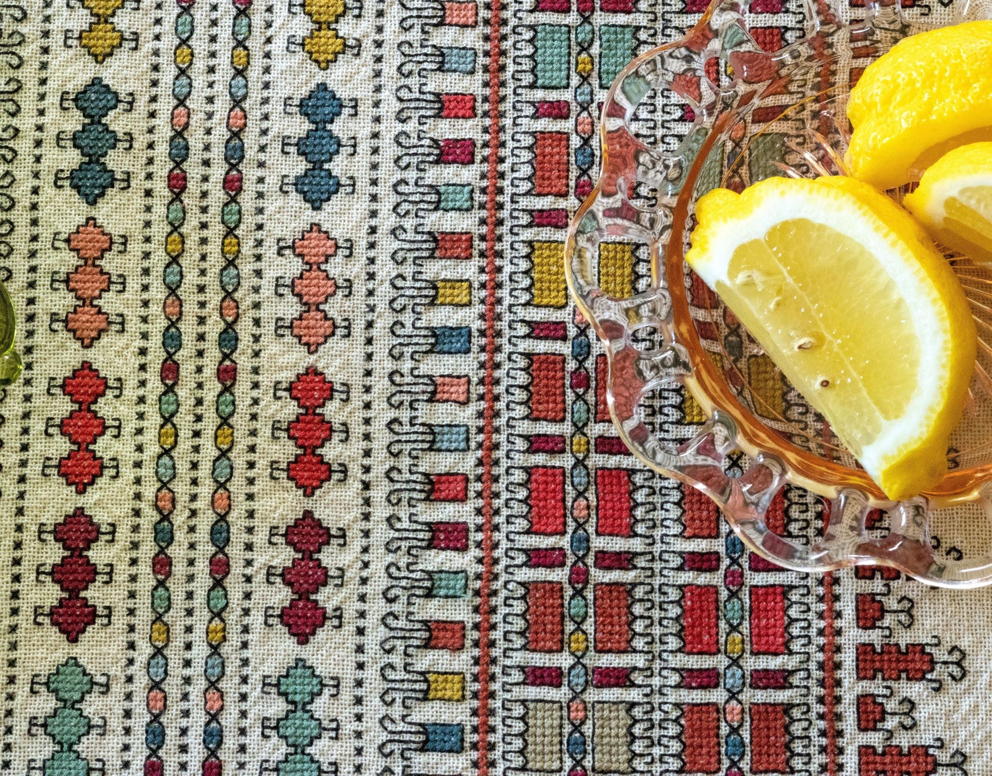 The Iris' Paintbox folk embroidery kit is inspired by an embroidered table scarf a friend purchased from a needleworker in the Agrinio area of mainland Greece in the 1970s which was in turn inspired by a Greek folk costume. Its vibrant color palette sets a lively rainbow of hues within a traditional terra cotta and black framework for a truly striking and unconventional design. Shown worked as a table runner, it would also make a gorgeous cushion cover by stitching less repeats of the design. Kit includes: 26ct 100% cotton Traditional Groundcloth in natural, DMC 100% cotton embroidery floss, John James size 24 needle, full color charts and instructions (a PDF copy of the pattern will also be sent to you).