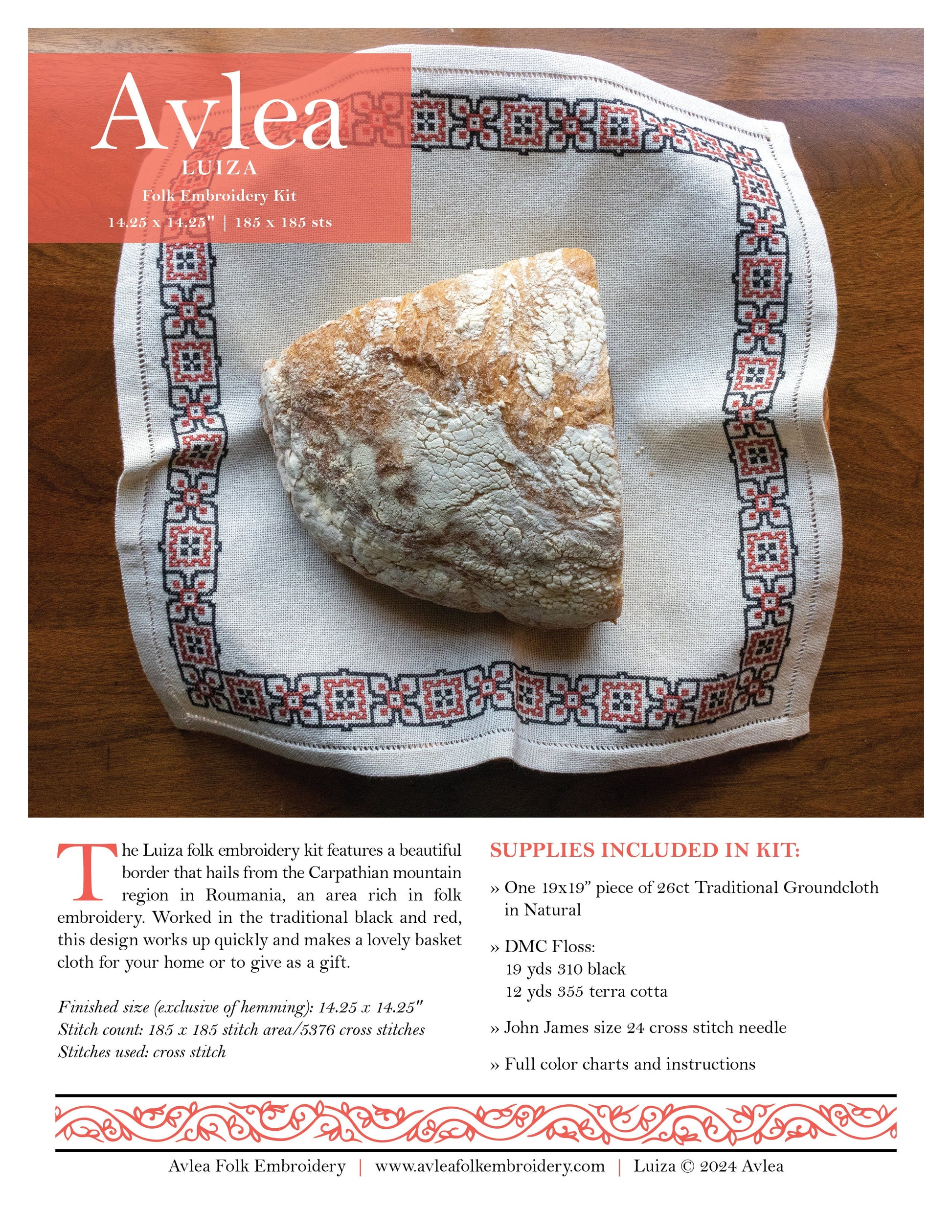 The Luiza folk embroidery kit features a beautiful border that hails from the Carpathian mountain region in Roumania, an area rich in folk embroidery. Worked in the traditional black and red, this design works up quickly and makes a lovely basket cloth for your home or to give as a gift. Kit includes: 26ct 100% cotton Traditional Groundcloth in natural, DMC 100% cotton embroidery floss, John James size 24 needle, full color charts and instructions (a PDF copy of the pattern will also be sent to you).