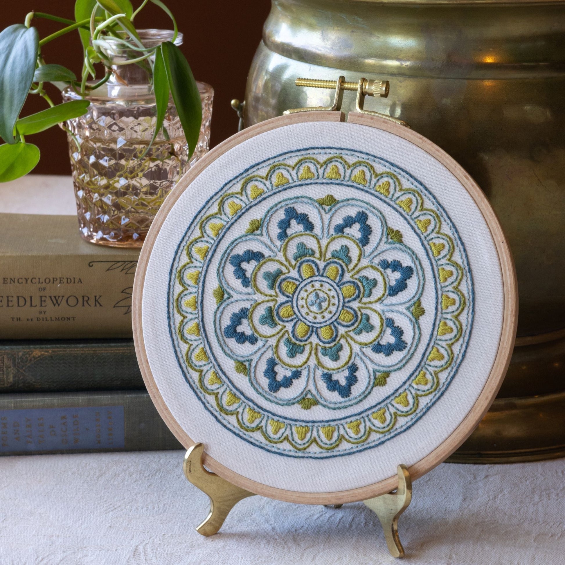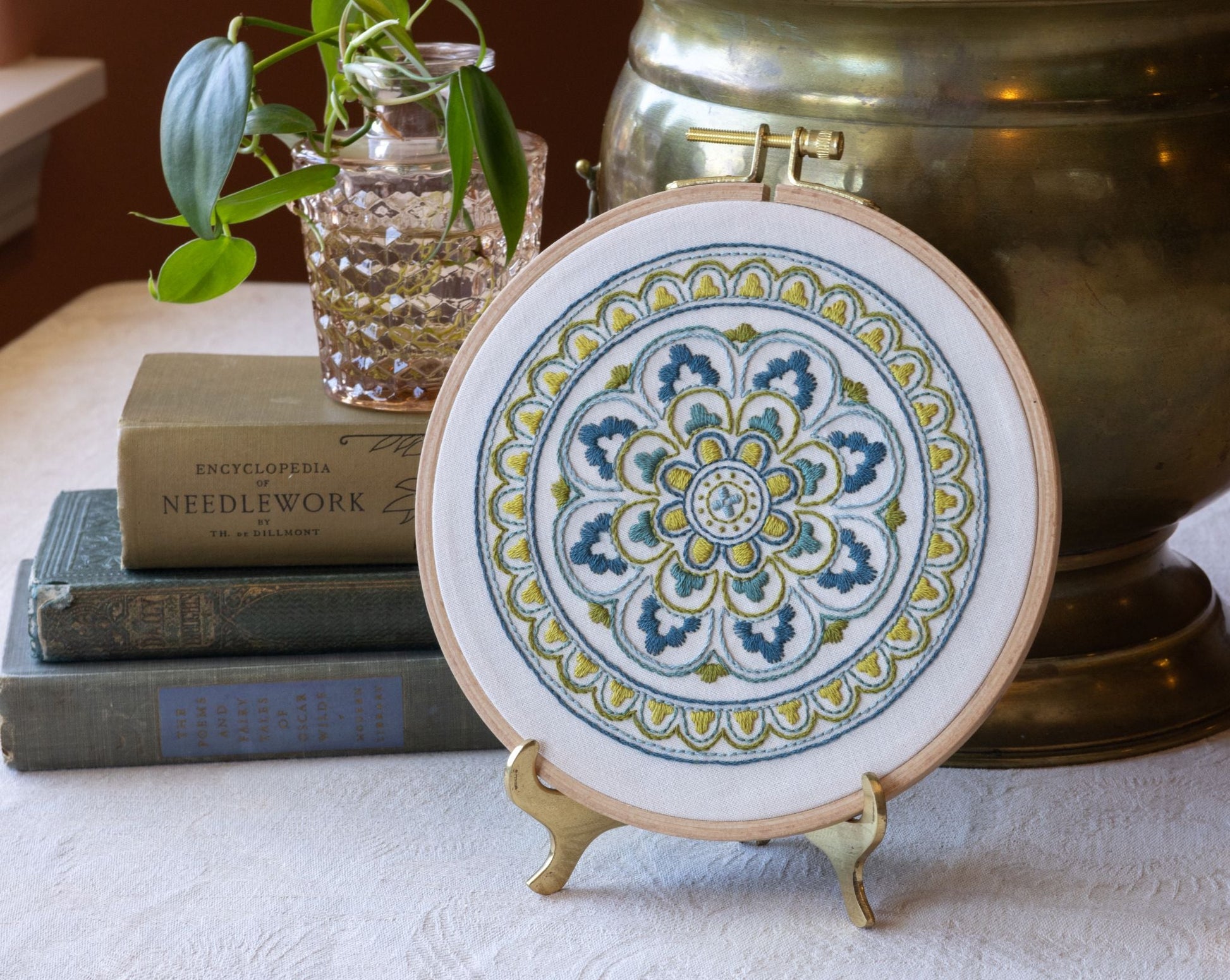 A vibrant medallion inspired by a Byzantine illuminated manuscript, the Myra Medallion folk embroidery hoop kit is terrific for both the beginner and experienced stitcher. While it looks intricate, it uses basic embroidery stitches and is a great first project if you want to explore surface embroidery. My high quality kits include the design printed on 100% Kona cotton, DMC 100% cotton embroidery floss, John James size 7 embroidery needle, how to embroider instruction booklet, stitch diagram, and 6' beechwood embroidery hoop.