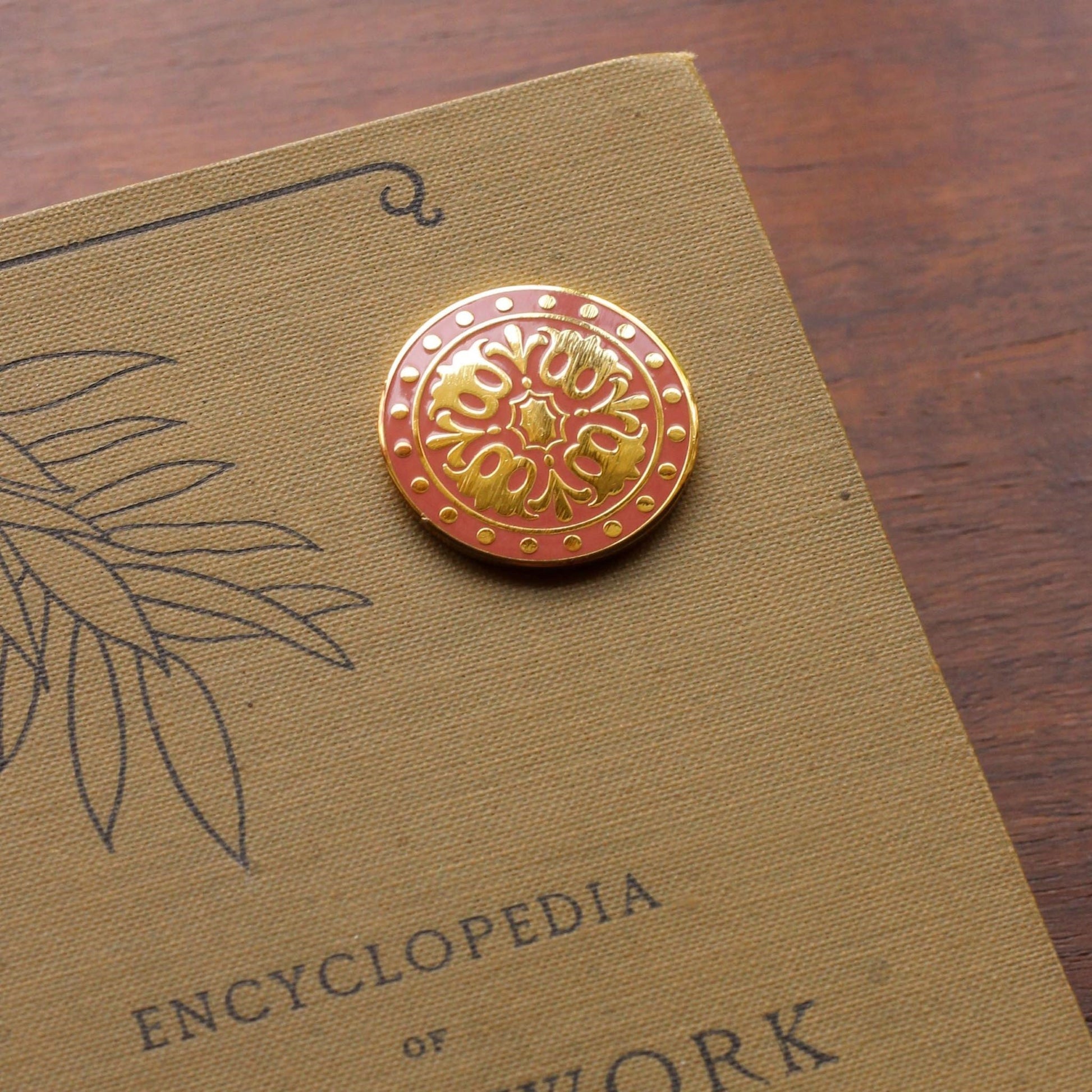 Byzantine Tulip is a stylized tulip with a pearled border in soft coral with gold enamel.