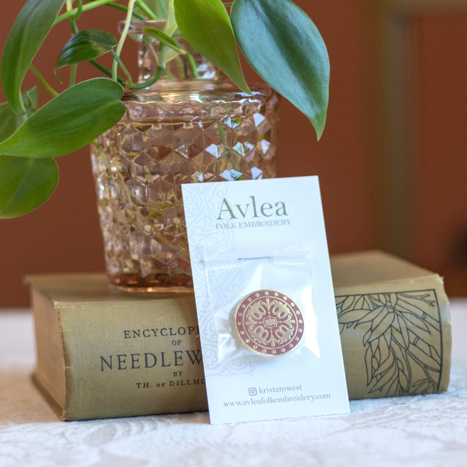 The Avlea Folk Embroidery "Byzantine Motifs" series of needleminders is inspired by the tiny decorations and ornamentations found in Byzantine manuscripts and iconography. These lovely motifs are tiny works of art! Needleminders are terrific for not just holding your needle when not in use, but for securing your fabric as you stitch, or holding your pattern to your frame. They can even be worn as a beautiful magnet pin! Needleminder is 1" across and comes with a 1/2" neodinum magnet (it's strong!)
