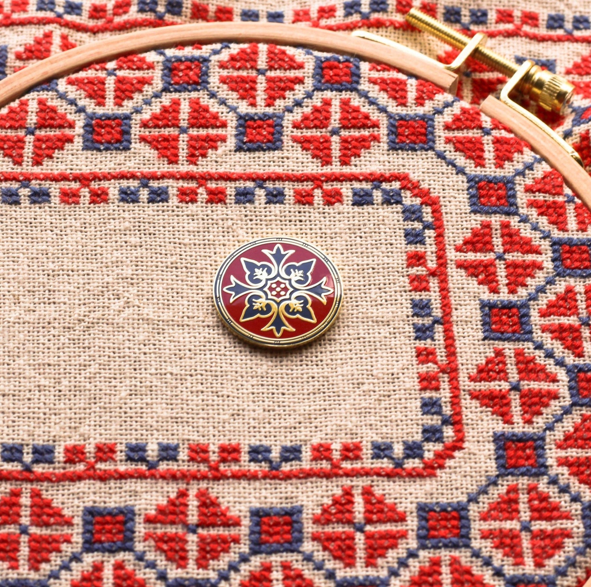 The Avlea Folk Embroidery "Byzantine Motifs" series of needleminders is inspired by the tiny decorations and ornamentations found in Byzantine manuscripts and iconography. These lovely motifs are tiny works of art! Needleminders are terrific for not just holding your needle when not in use, but for securing your fabric as you stitch, or holding your pattern to your frame. They can even be worn as a beautiful magnet pin! Needleminder is 1" across and comes with a 1/2" neodinum magnet (it's strong!)
