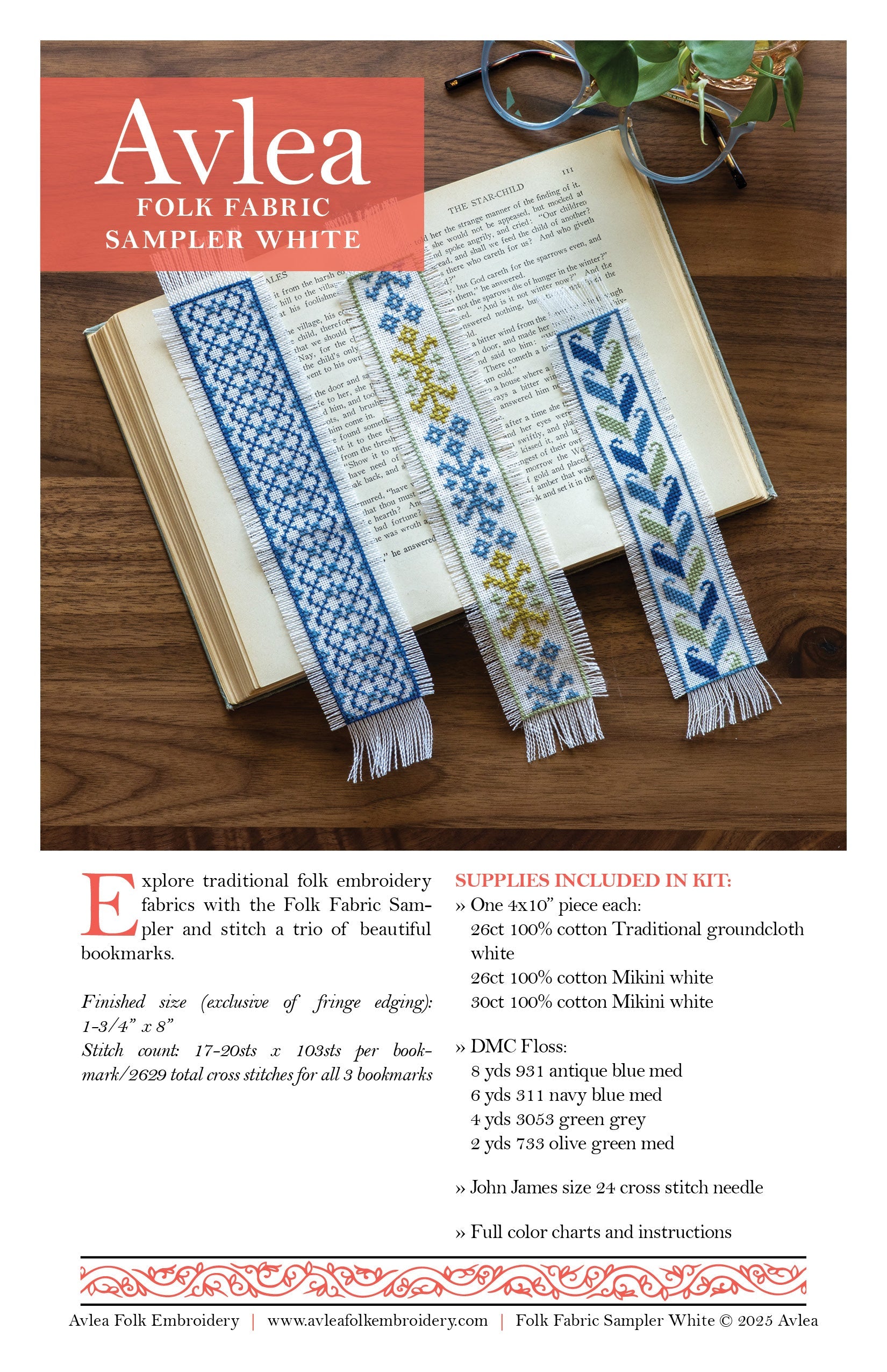 Stitch a trio of charming bookmarks while you explore authentic folk embroidery cross stitch fabrics. Great for gift giving!