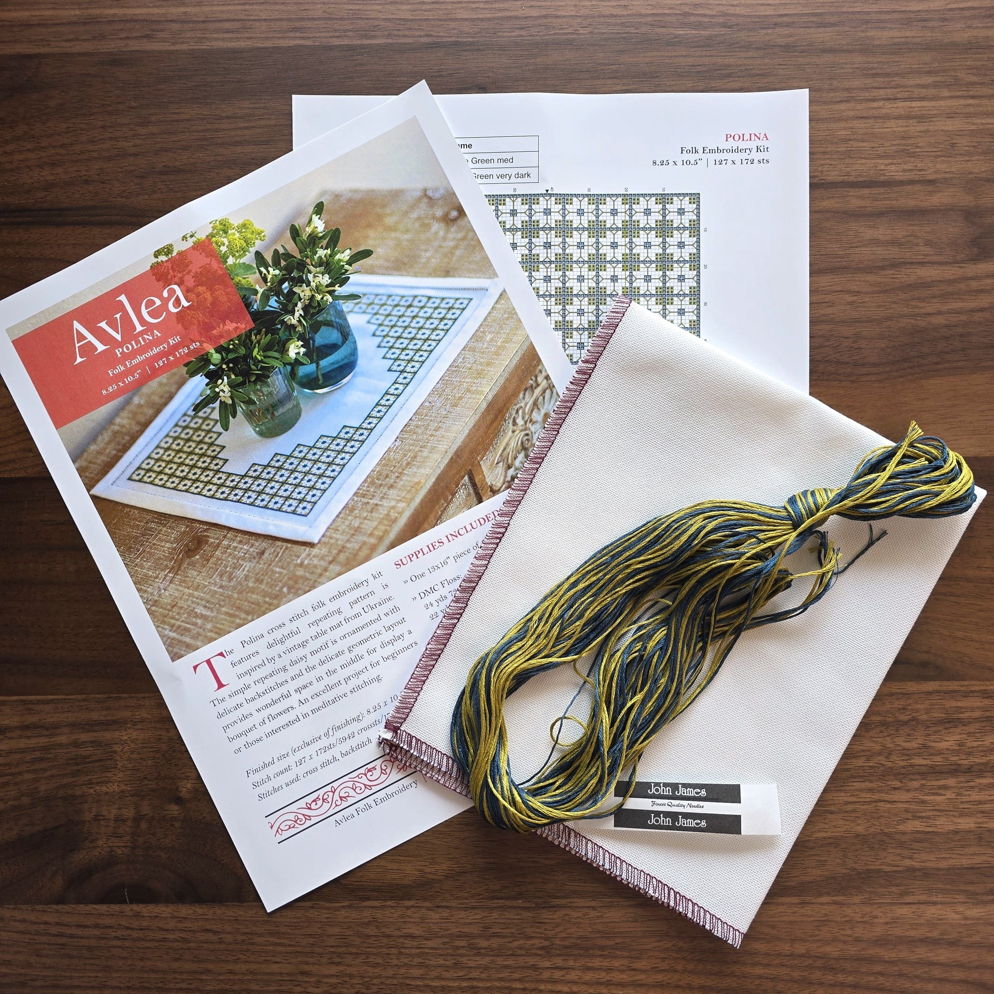 The Polina cross stitch folk embroidery kit features delightful repeating pattern is inspired by a vintage table mat from Ukraine. The simple repeating daisy motif is ornamented with delicate backstitches and the delicate geometric layout provides wonderful space in the middle for display a bouquet of flowers. An excellent project for beginners or those interested in meditative stitching. Kit includes: 30ct 100% cotton Mikini white, DMC 100% cotton embroidery floss, John James size 24 needle, full color charts and instructions (a PDF copy of the pattern will also be sent to you).