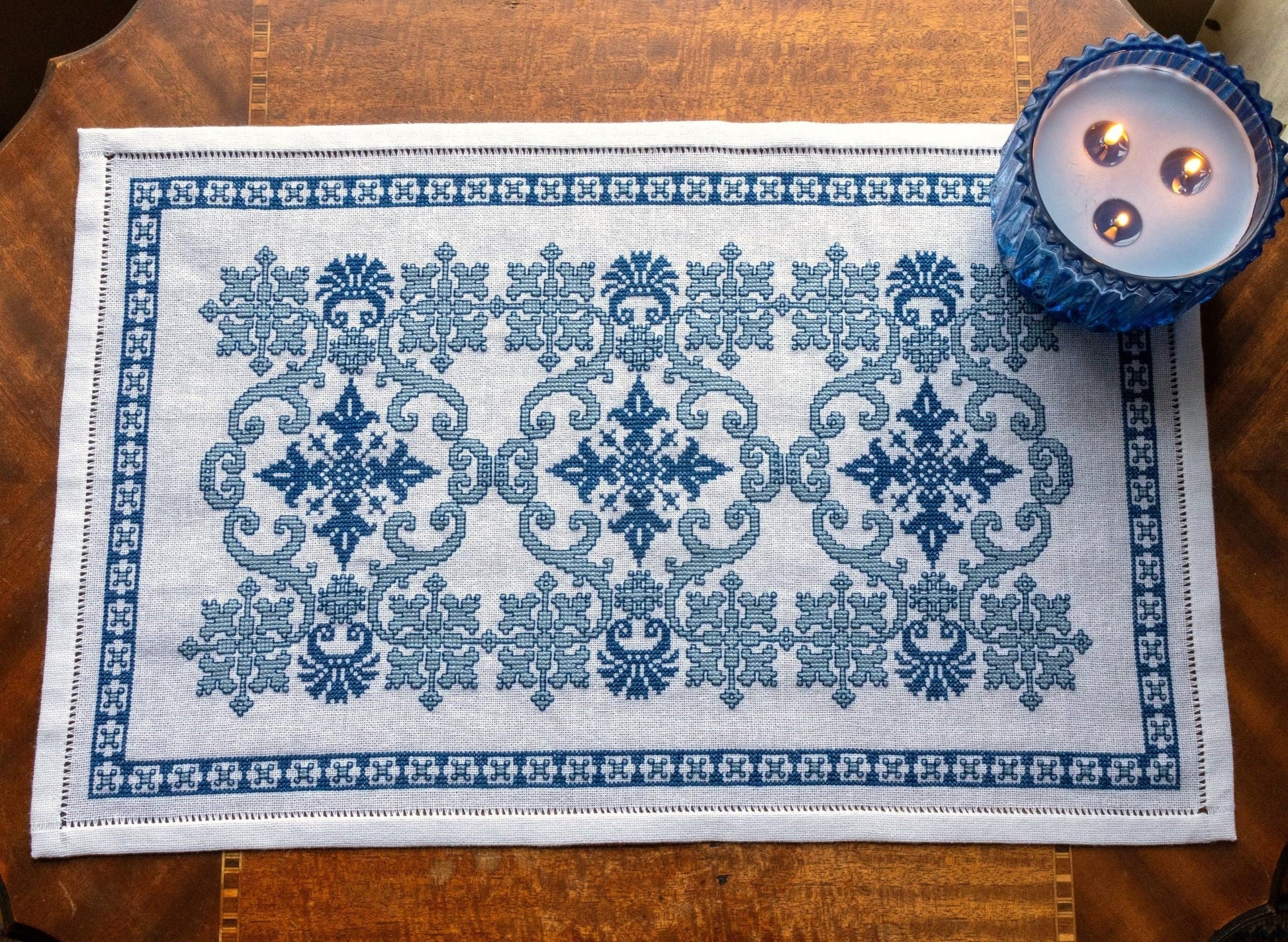 The design in the Stavroula folk embroidery kit is a favorite among needleworkers in Greece and I have seen it in numerous variations over the years, from small table mats with a single motif to larger table runners with multiple motifs in a half-drop repeat. A simple two-tone palette with a light shade outlined in a darker shade is a classic technique used in many folk embroideries and is shown here to great effect. The delicate scroll work, two cross motifs, and a small palmette flourish create a design resplendent with ancient art motifs. Kit includes: 26ct 100% cotton Traditional Groundcloth in white, DMC 100% cotton embroidery floss, John James size 24 needle, full color charts and instructions (a PDF copy of the pattern will also be sent to you).