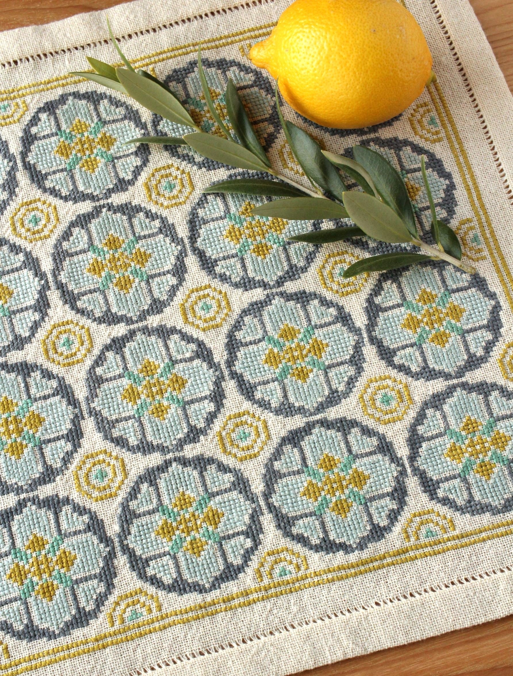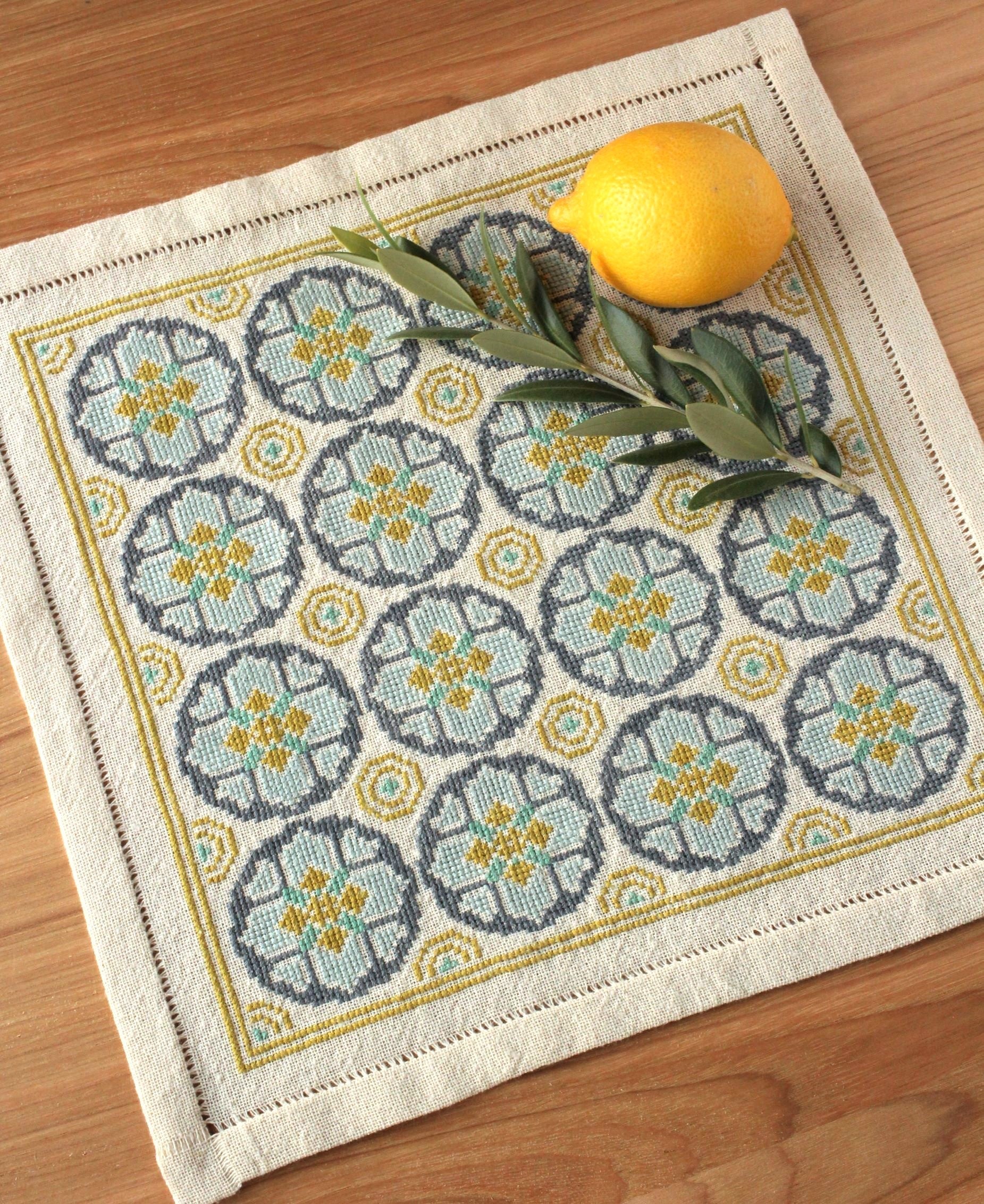 The Venetian Coins folk embroidery kit features a repeating geometric design that reminded me of coins made throughout the medieval world, often featuring cross designs. Worked in shades of pewter gray and olive green to mimic the metals from which old coins were minted, this design can be worked in the square arrangement as shown (nice for cushion covers or as a square table mat), or as a long table runner with a larger piece of cloth. Kit includes: 26ct 100% cotton Traditional Groundcloth in natural, DMC 100% cotton embroidery floss, John James size 24 needle, full color charts and instructions (a PDF copy of the pattern will also be sent to you).